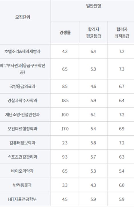 * 일반전형으로 선발하는 그 외 주요 학과의 입결은 위와 같습니다. 국방응급의료학과를 제외하고 평균 5~ 6등급대의 고른 평균을 보이며, 최저와 평균의 차이가 다소 큰 점은 유의할 필요가 있습니다.