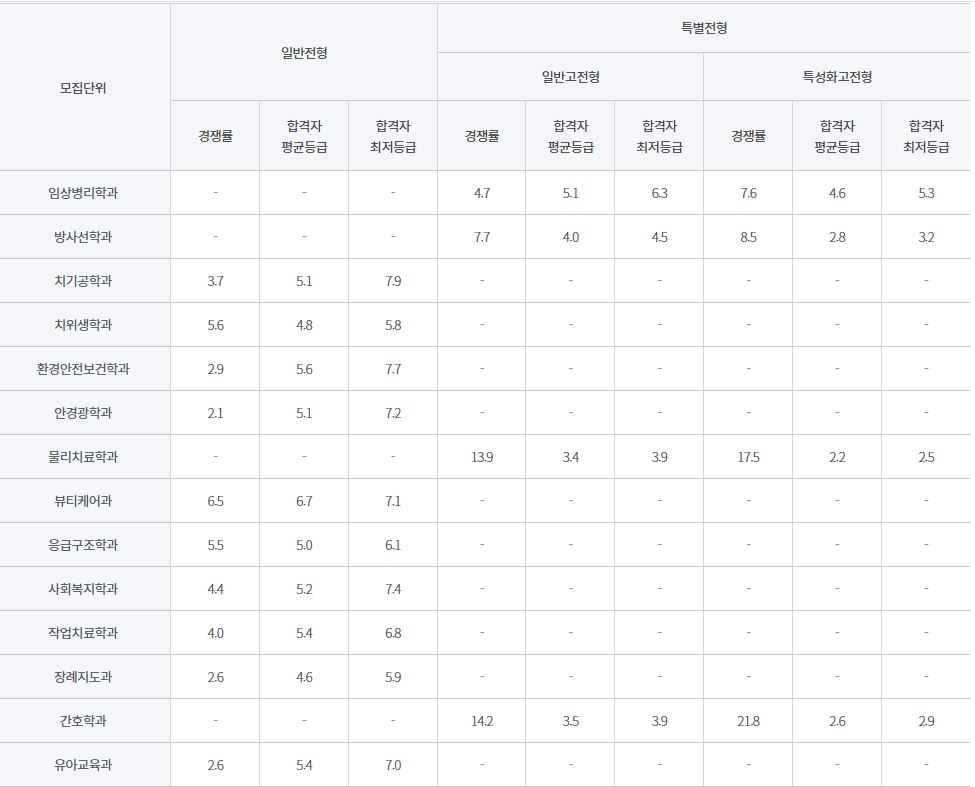 * 임상병리, 방사선, 물리치료 및 간호학과의 경우 수시 1차에서 특별 전형으로만 선발하는 점을 유의해야 합니다. 물리치료학과 및 간호학과의 경우 일반고는 3등급대, 특성화고는 2등급대의 평균을 보입니다.